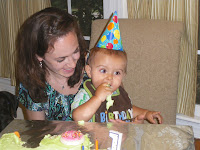 We've had so much fun celebrating such a special birthday with you! First, you had your favorite...a monkey cake :) (a monkey for our little monkey!). Monkeys ALWAYS make you smile and giggle (you've had one in your crib forever) so Mama wanted to make you this cake for your first birthday.